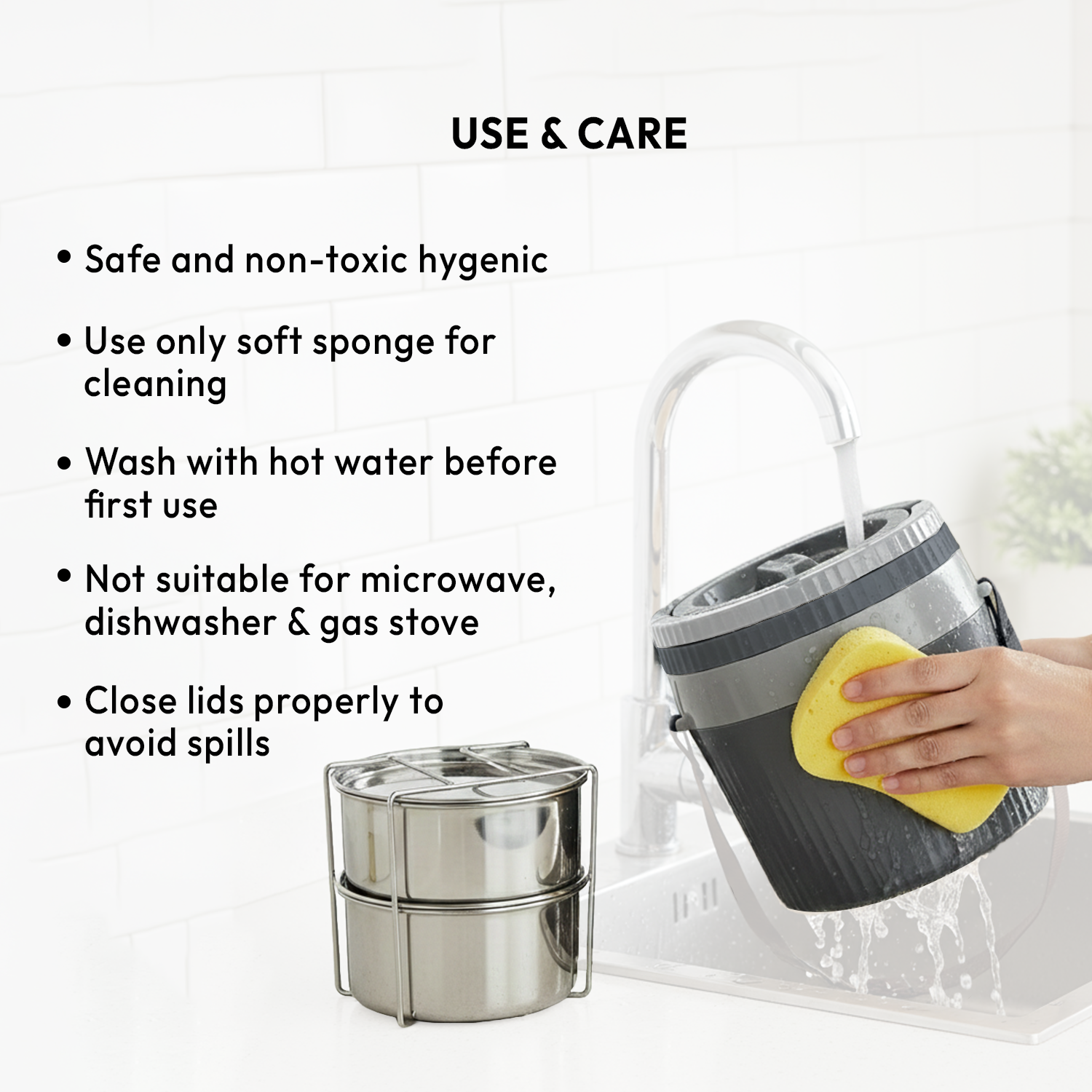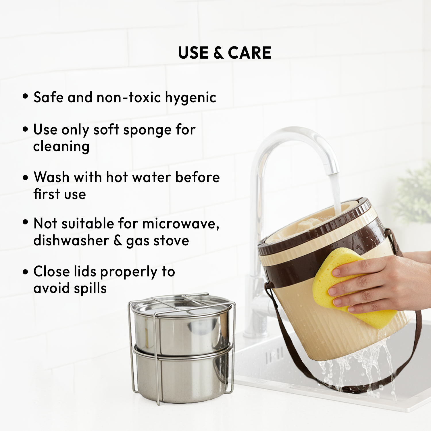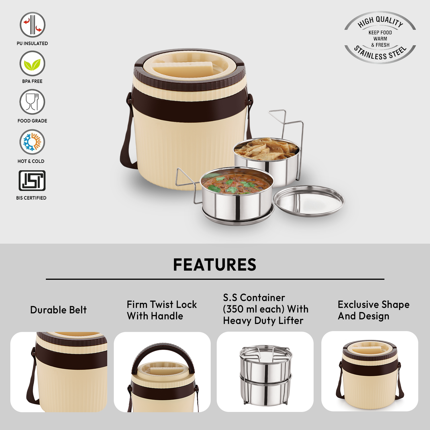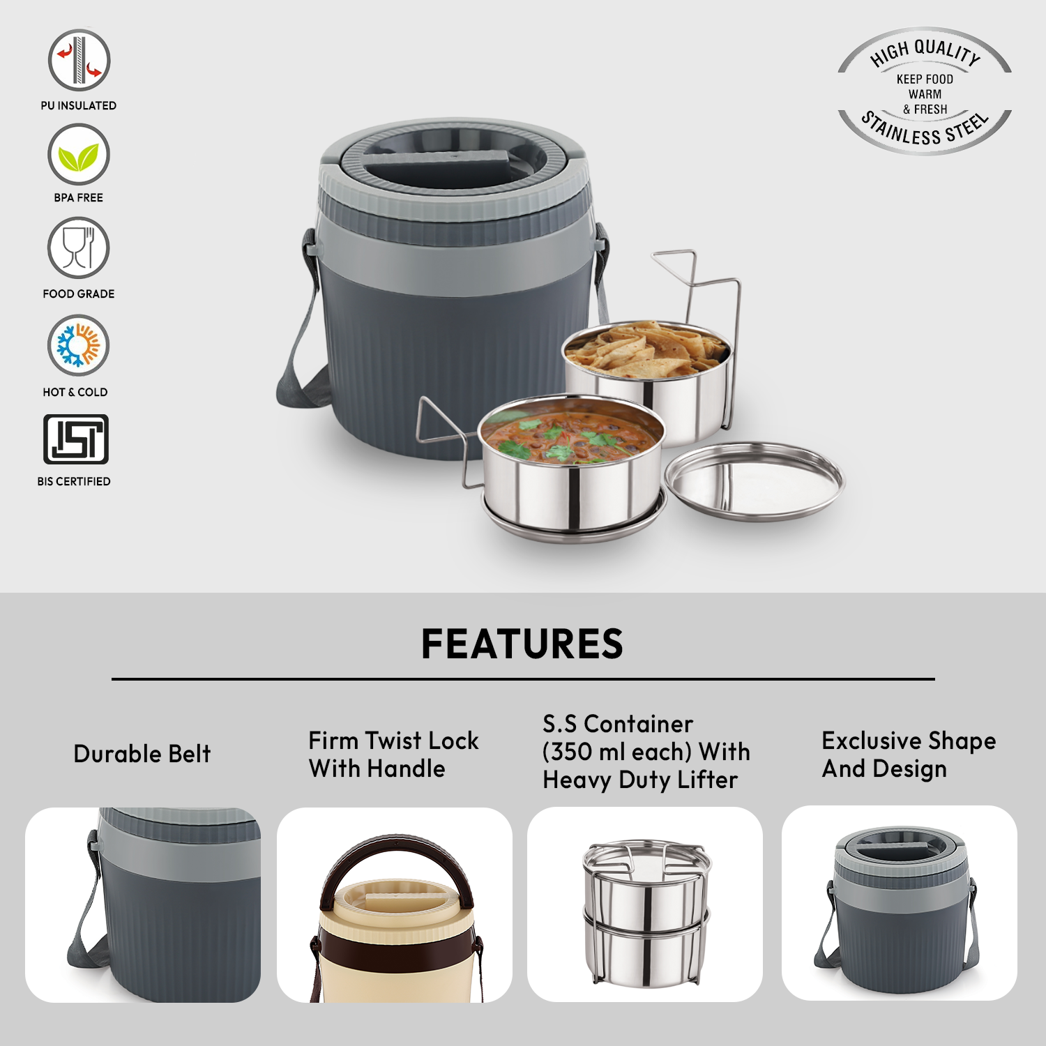 - Material: Premium stainless-steel containers with PUF insulation to maintain food temperature and BPA-free construction.