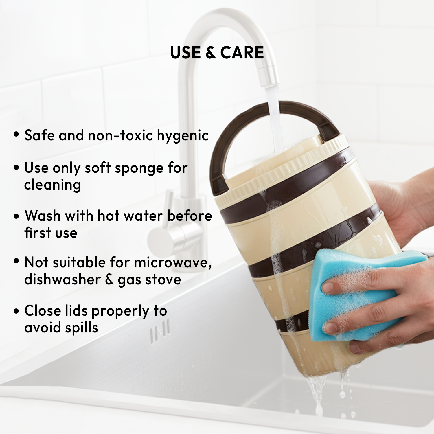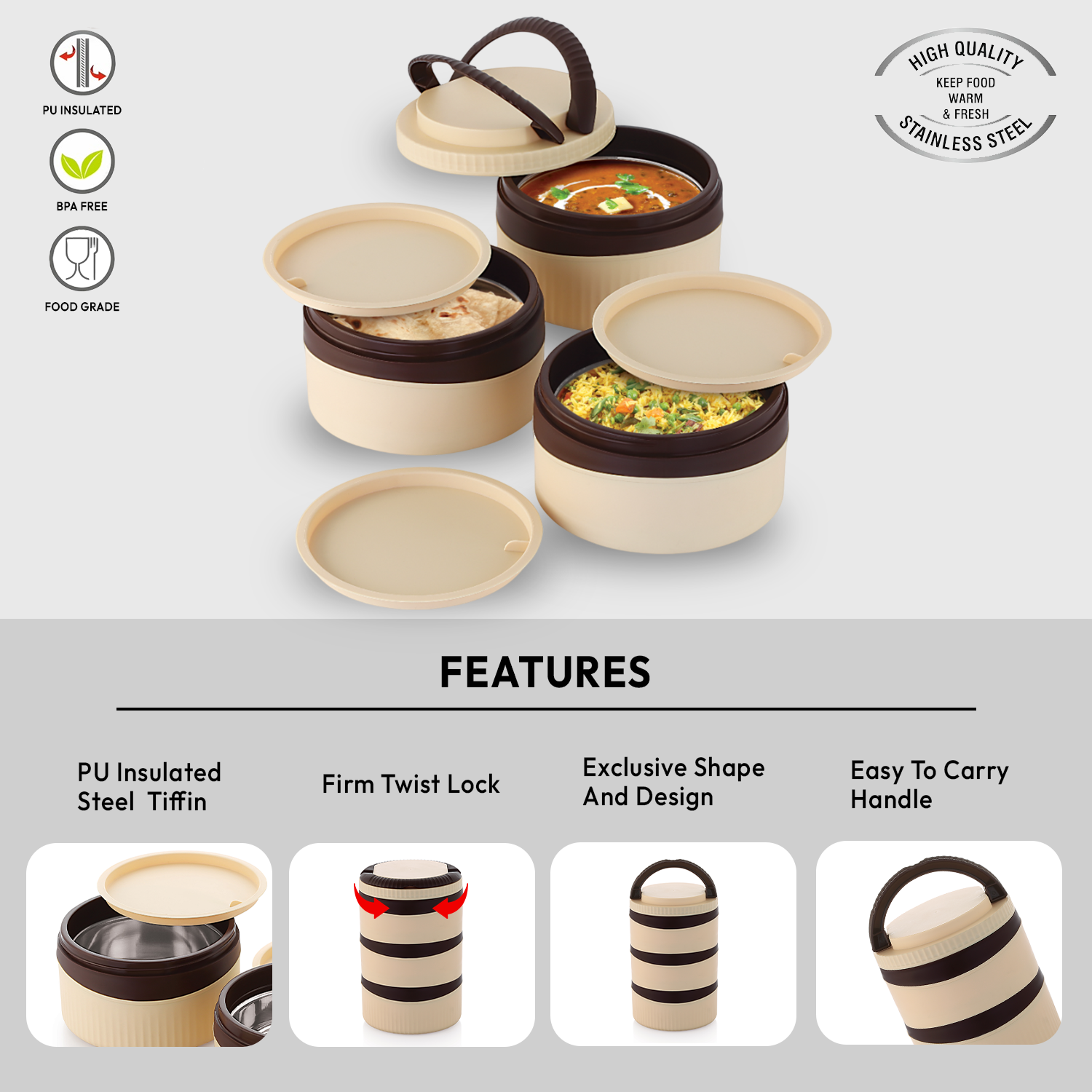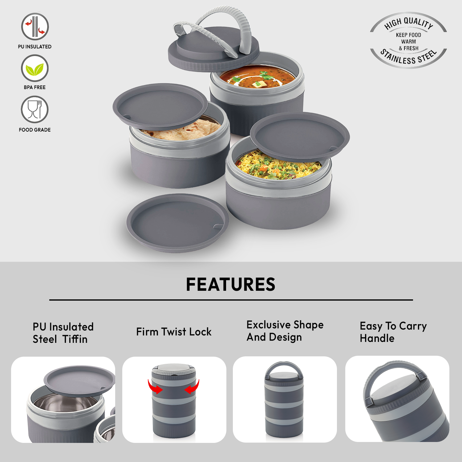 - Material: Premium stainless-steel containers with PUF insulation to maintain food temperature and BPA-free construction.
